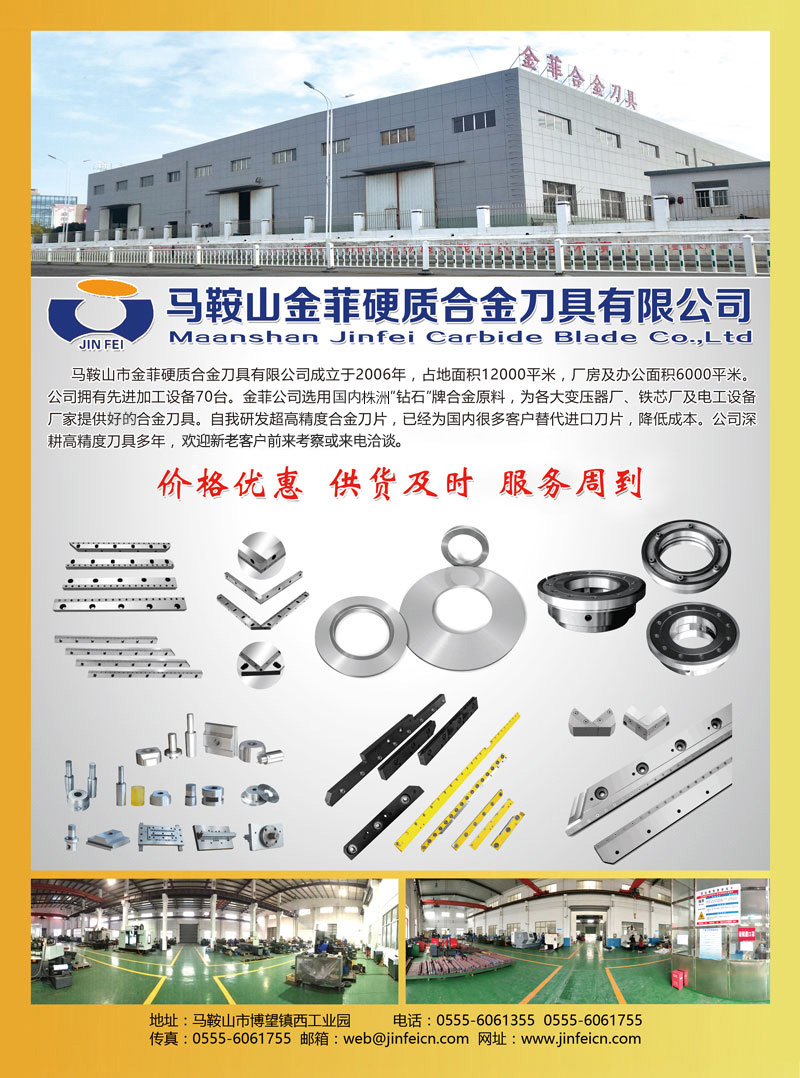 馬鞍山市金菲硬質(zhì)合金刀具有限公司成立于2006年,占地面積12000平米,廠房及辦公面積6000平米。公司擁有加工設(shè)備70臺。金菲公司選用國內(nèi)有名'鉆石"牌合金原料,為各大變壓器廠、鐵芯廠及電工設(shè)備廠家提供合金刀具。自我研發(fā)超高精度合金刀片,已經(jīng)為國內(nèi)很多客戶替代進口刀片,降低成本。公司深耕高精度刀具多年,歡迎新老客戶前來考察或來電洽談。