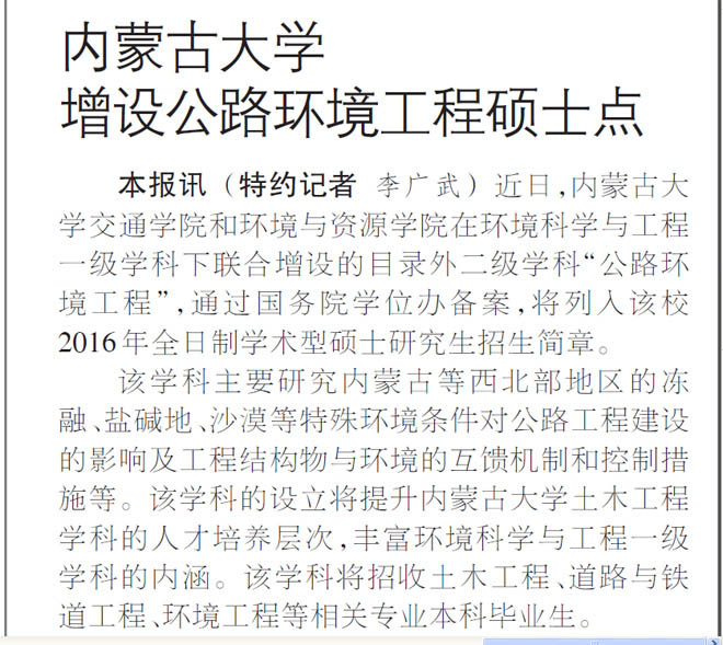 中國(guó)交通報(bào):內(nèi)蒙古大學(xué)增設(shè)公路環(huán)境工程碩士點(diǎn)