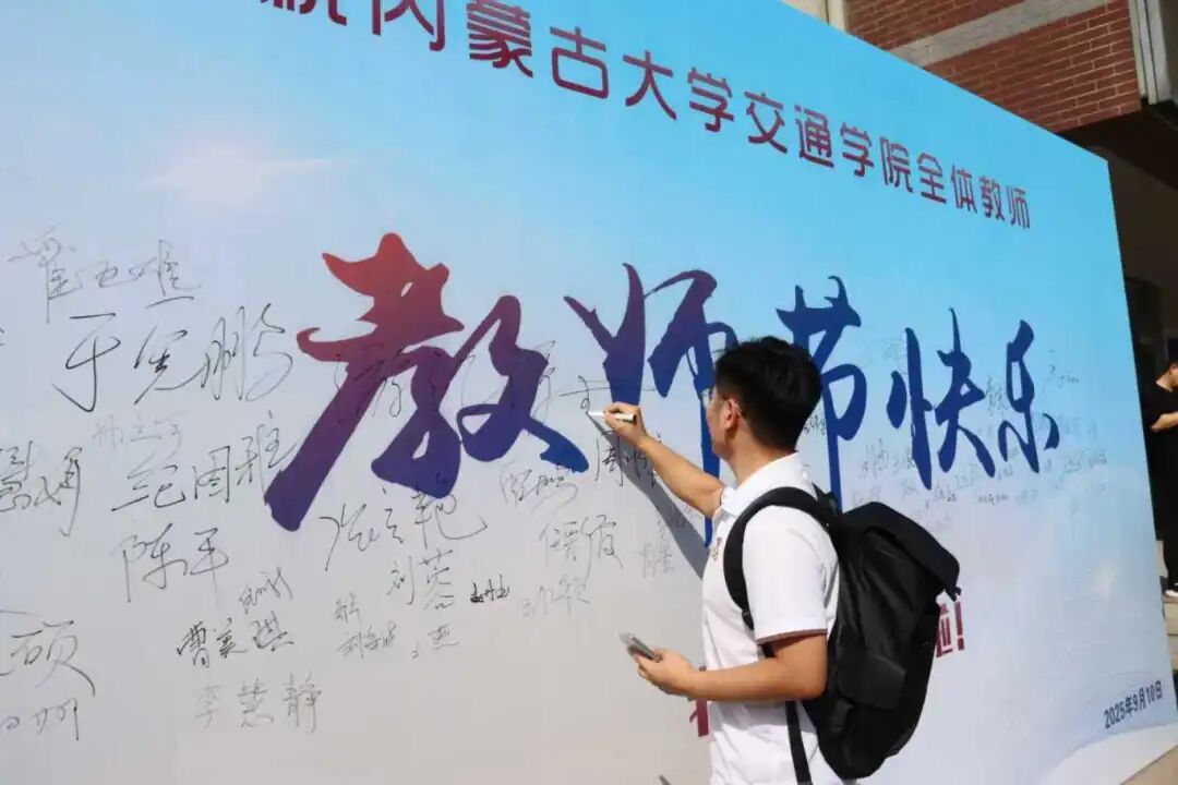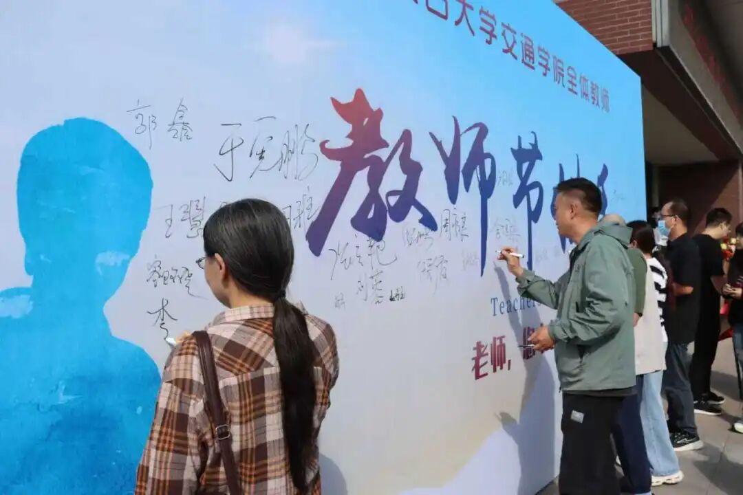 金秋送爽,桃李芬芳。9月10日上午十時(shí),交通學(xué)院慶祝第41個(gè)教師節(jié)“師生送祝?!焙灻麅x式準(zhǔn)時(shí)啟動(dòng)。學(xué)院領(lǐng)導(dǎo)白托婭、高飛、周永良及現(xiàn)場(chǎng)200多名師生在簽名墻上留下筆墨?;顒?dòng)正值課間,上千名學(xué)生懷揣感恩之心駐足現(xiàn)場(chǎng),紛紛向自己敬愛(ài)的老師鞠躬致意,送上節(jié)日祝福,與老師們合影留念。老師們笑容滿面,互致節(jié)日問(wèn)候,分享著身為教育工作者的幸福與自豪。